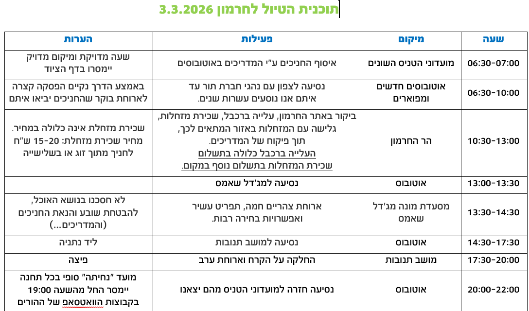 | 6:30-10:30 | אוטובוסים חדישים ומפוארים | נסיעה לצפון עם נהגי חברת תור עד איתם אנו נוסעים עשרות שנים. | באמצע הדרך נקיים הפסקה קצרה לארוחת בוקר שהחניכים יביאו איתם |